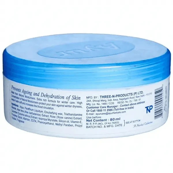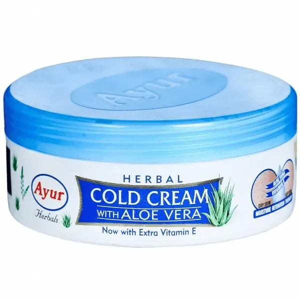 Ayur Herbal Cold Cream with Aloe Vera (80 ml) is a nourishing skincare product designed to moisturize and soothe dry skin. Enriched with the healing properties of aloe vera, this cream provides deep hydration, reduces irritation, and promotes a soft, supple complexion. Its herbal formulation ensures gentle care, making it suitable for all skin types. Ideal for daily use, it protects the skin from environmental stressors while maintaining natural moisture balance. The compact 80 ml size makes it convenient for travel and everyday use.