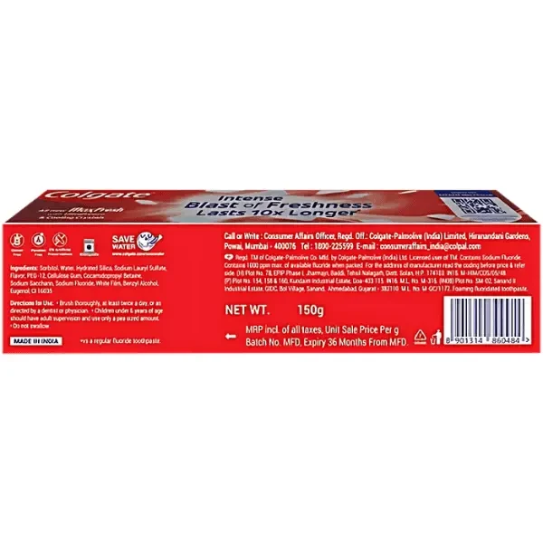 Colgate Max Fresh Spicy Fresh Red Gel Toothpaste (150 gm) offers a refreshing and invigorating brushing experience. Infused with a unique spicy fresh flavor, it leaves your mouth feeling cool and clean. The advanced formula helps fight cavities, freshens breath, and removes plaque for optimal oral hygiene. The vibrant red gel texture ensures a thorough clean while providing a long-lasting fresh sensation. Ideal for daily use, this toothpaste promotes healthy gums and strong teeth. Its compact 150 gm tube is convenient for travel and everyday use, making it a perfect choice for those seeking a bold and refreshing oral care solution.