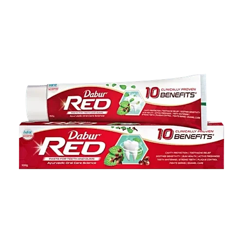 ZZ-Dabur Red Toothpaste 100 gm is a herbal toothpaste designed to promote oral hygiene. Infused with natural ingredients, it helps in fighting germs, preventing cavities, and maintaining fresh breath. The unique red formula provides effective cleaning while being gentle on gums. Ideal for daily use, it ensures strong teeth and healthy gums. Free from harmful chemicals, it is a safe choice for the entire family. The 100 gm pack offers long-lasting usage, making it a convenient addition to your oral care routine.