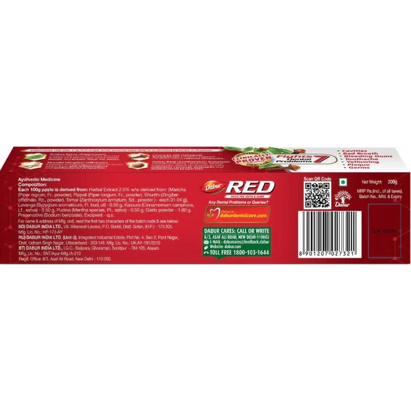 DABUR RED PASTE has a clinically proven formula that fights against 7 DENTAL PROBLEMS: 1) Toothache, 2)Cavities, 3) Plaque, 4) Germs, 5) Bad Breath, 6) Yellowing, and 7) Bleeding Gums. It is fluoride free and made with 13 potent ayurvedic ingredients including Pudina Satva that provides fresh breath, Laung ka Tail that relieves toothache, Shunthi that has anti-inflammatory and antibacterial properties, and Tomar Beej that has antiseptic and antibacterial properties. It is clinically shown to provide a remarkable 35% improvement in oral care hygiene compared to regular toothpaste and provides complete protection for the entire family.