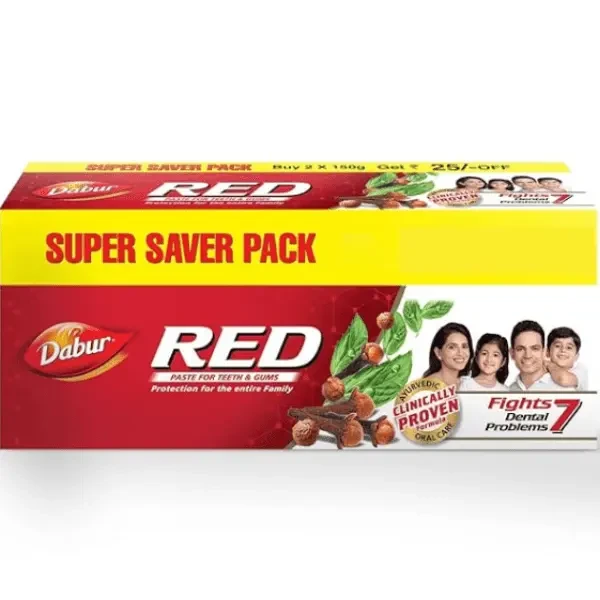 Dabur Red Paste Has A Clinically Proven Formula and recognised By Indian Dental Association, Dabur Red Paste Has A Clinically Proven Formula That Fights Against 7 Dental Problems 1) Toothache, 2)Cavities, 3) Plaque, 4) Germs, 5) Bad Breadth, 6) Yellowing, And 7) Bleeding Gums. It Is Fluoride Free And Made With 13 Potent Ayurvedic Ingredients Including Pudina Satva That Provides Fresh Breath, Laung Ka Tail That Relieves Toothache, Shunthi That Has Anti-Inflammatory And Antibacterial Properties, And Tomar Beej That Has Antiseptic And Antibacterial Properties. It Is Clinically Shown To Provide A Remarkable 35% Improvement In Oral Care Hygiene Compared To Regular Toothpaste And Provides Complete Protection For The Entire Family.