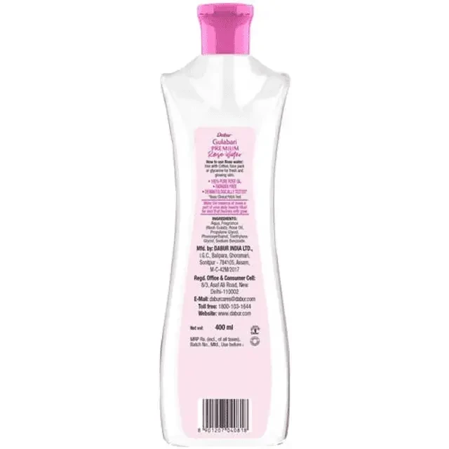 Dabur Gulabari Premium Rose Water 400 ml is a natural and refreshing skincare product made from pure rose petals. It helps in toning, hydrating, and rejuvenating the skin, leaving it soft and glowing. Ideal for all skin types, it can be used as a facial mist, makeup remover, or toner. Its soothing fragrance also helps in reducing stress and refreshing the mind. Free from harmful chemicals, it is a perfect addition to your daily beauty routine for a radiant and healthy complexion.